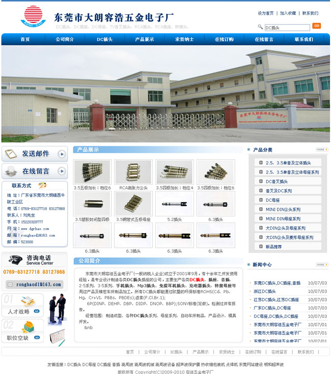 东莞市大朗容浩五金电子厂(一般纳税人企业)成立于2001年9月,有十余年之开发使用经验,是专业设计制造各类DC插头插座的公司,主要生产各类DC插头、插座、音插、2·5系列、3·5系列、手机插头、Mp3插头、免提耳机插头、充电器插头、转接母座等周边产品及精密车床制品加工。所有DC插头都能通过欧盟的环保标准ROHS(Cd、Pb、Hg、Cr+VI、PBBs、PBDEs);卤素(F.Cl.Br.1);